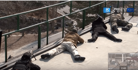 잠시후 작전개시를 알리는 ‘저격’ 명령이 떨어지자 행동이 기민해지기 시작했다. “셋, 둘, 하나, 출발” 검은 복장의 2명이 허리를 90도로 꺽고 지그재그로 시외버스 앞쪽으로 내달리자 버스창밖으로 소총이 난사됐다.