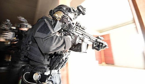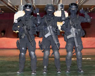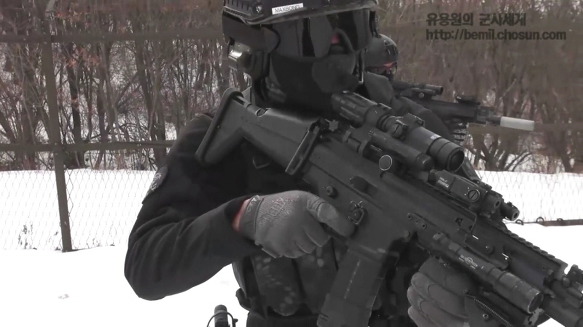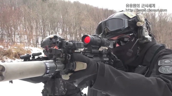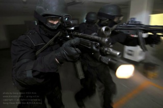 ㅇMP5로 무장하고 훈련중인 707특임대 대원/ 전원이 저격용 소총으로 1,000m거리에서 목표를 정확히 저격하고 석궁, 독침에다 젓가락까지도 살상무기로 활용된다. 특공무술은 최하 5단이며 ‘707의 힘’은 365일 단 하루도 빠지지않고 반복되는 실전훈련과 10년이상 한솥밥을 먹으며 다져온 탄탄한 팀워크에서 나온다는 게 부대측의 설명이다.