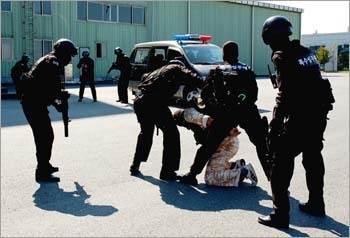 육군수사단 중앙수사대 특수임무대원들이 '2008 재난대비 긴급구조종합훈련'에 참가하여 신속한 대테러 작전을 펼치고 있다.