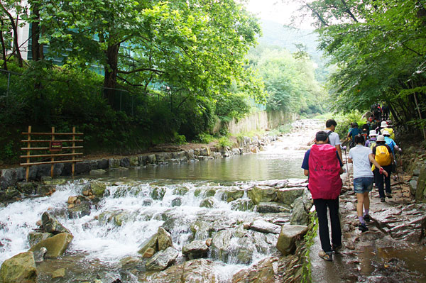호수공원부터 길은 물줄기를 놓지 않고 왼쪽과 오른쪽 연안을 건너다니며 거슬러 오른다. 조금씩 위로 올라간다는 느낌은 물줄기를 바라보는 시선으로만 감지될 뿐 몸은 평지 숲길을 걷는 것마냥 가뿐하다.