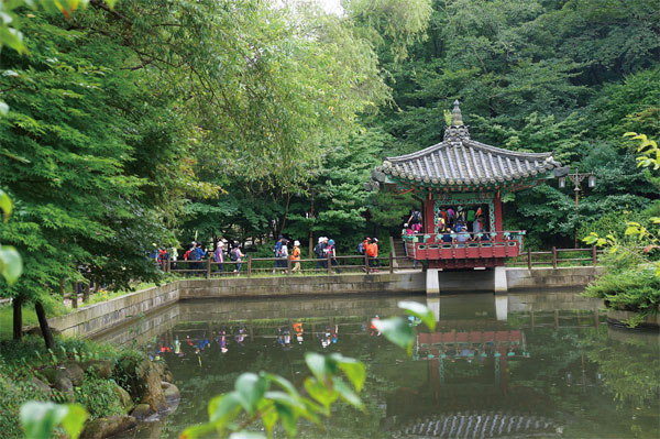 호수 가운데 신선이 사는 땅을 상징하는 섬이 박혀 있고 그리로 넘어가는 다리가 놓였다. 상류 쪽으로는 창덕궁 애련정을 모티브 삼아 지은 듯한 아담한 정자(亭子)가 잔잔한 수면에 지나는 사람들과 함께 비쳐 든다.